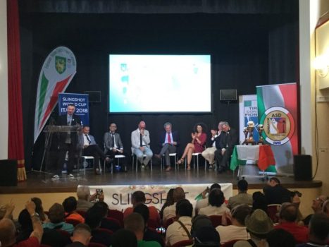 In un teatro Talia stracolmo di atleti e curiosi provenienti da tutto il mondo si è svolto stamattina (giovedì 21 giugno) il meeting internazionale di Tiro con la Fionda che ha dato inizio al Primo Mondiale di questo sport, che si svolgerà a Gualdo Tadino dal 21 al 24 giugno.