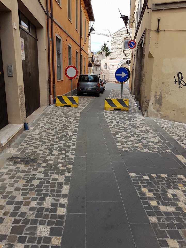 A mali estremi, estremi rimedi, e così contro gli automobilisti furbetti che cercano di aggirare i varchi elettronici in centro storico, il Comune di Foligno ci è andato giù con la mano pesante. Nei giorni scorsi infatti, in ia Scarpellini hanno fatto la loro comparsa due grandi blocchi di cemento tinteggiati di giallo e nero, per sbarrare la strada, nel vero senso della parola, a chi cercava di bypassare le telecamere di via XX Settembre.