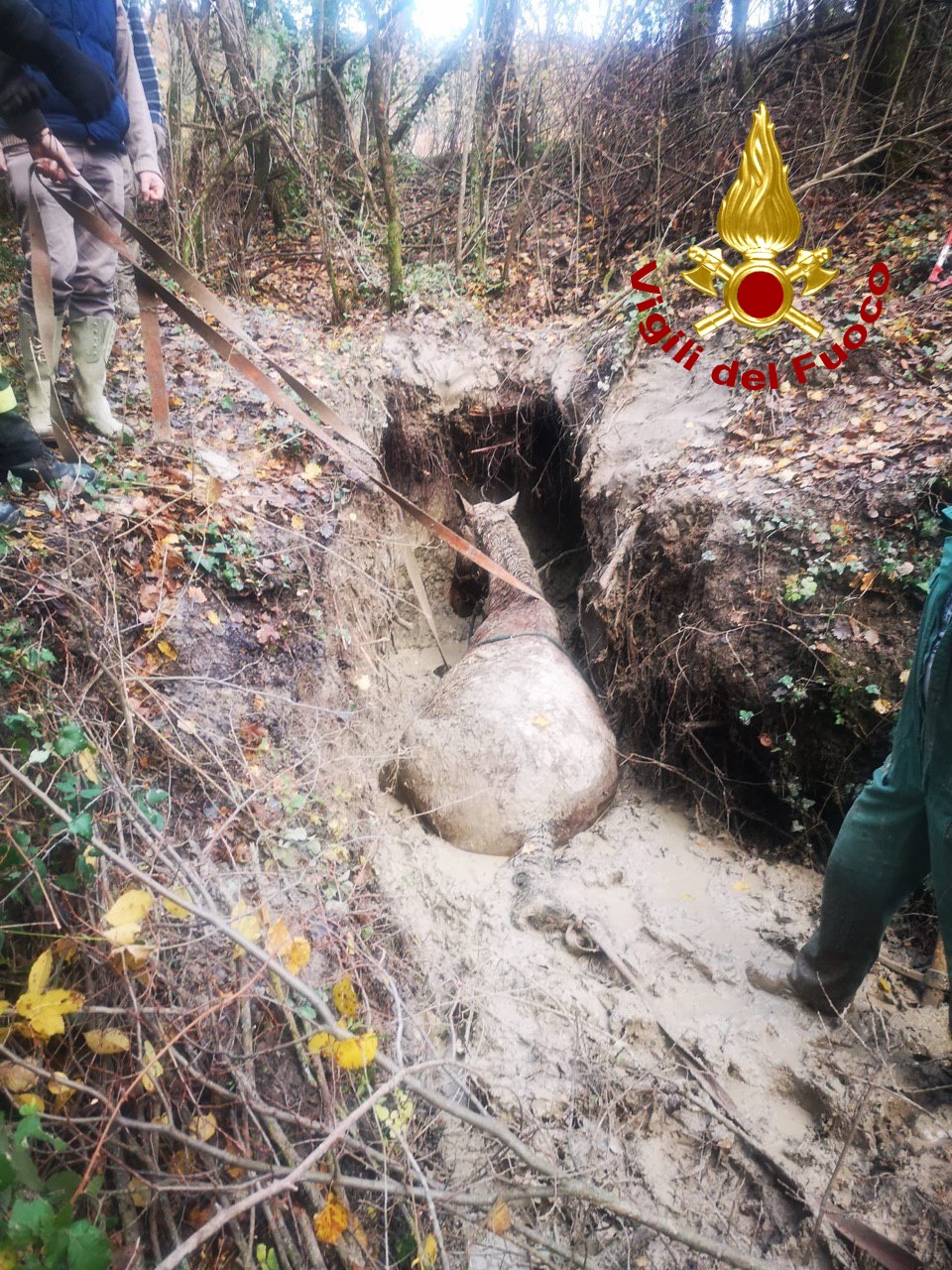 I vgili del fuoco di Spoleto sobo intervenuti in località Borgiano intorno alle 15:45 di venerdì per il recupero di una cavalla adulta caduta in un fosso e rimasta impantanata circa 3 giorni fa.