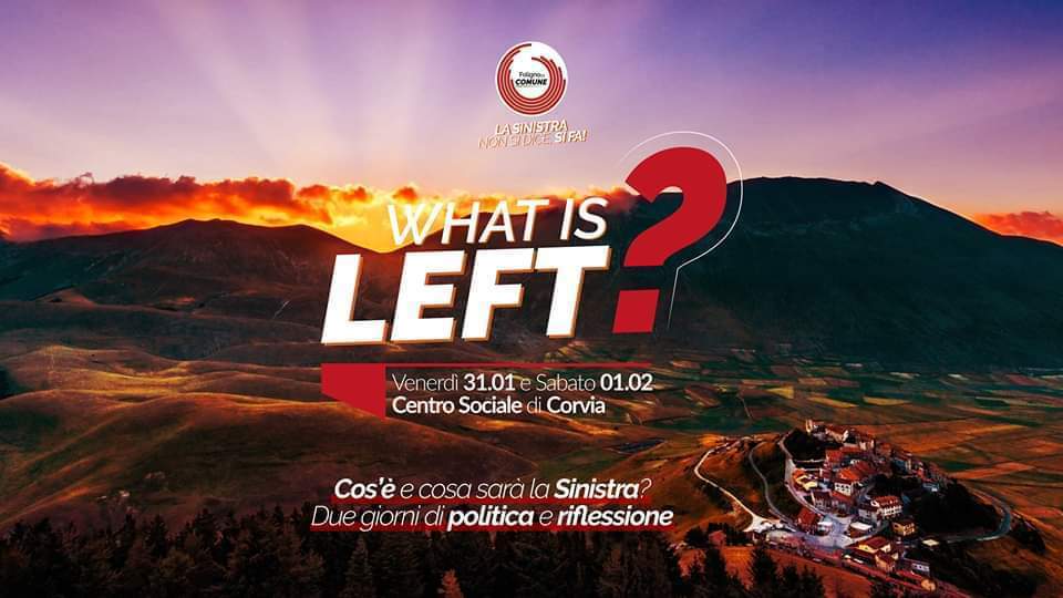 Sabato 01 febbraio alle ore 17.30 si terrà uan tavola rotonda dal titolo “What is Left?” sulla sinistra e le sue prospettive. Parteciperanno Giorgia Azzarelli (Foligno 2030), Matteo Bartoli (segretario di Sinistra Italiana Foligno), Lorenzo Falistocco (Rifondazione Comunista), Marco Bizzarri (segretario FILT CGIL Umbria), Alessandro Sorrentino (Foligno in Comune), Tommaso Bori (Consigliere Regionale PD Umbria), Thomas De Luca (Consigliere Regionale M5s Umbria), Giulia Titoli (Sardine Perugia), coordina Vincenzo Falasca (Sinistra Civica e Verde).