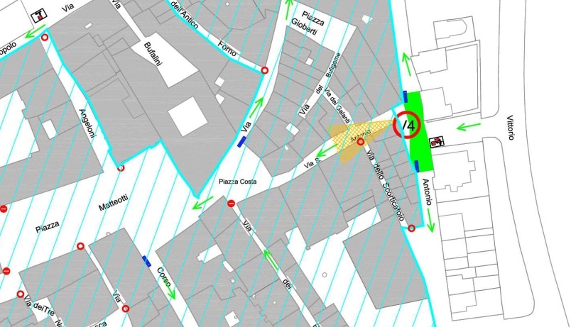 - l’area “ZTL 3” funzionerà (e quindi vieterà l’accesso ai non autorizzati) dalle 19.30 alle 6.30 nei giorni lunedì, martedì, mercoledì, venerdì, dalle ore 6.30 alle 15 e dalle 19.30 alle 6.30 nella giornata di giovedì, dalle ore 6.30 alle 15 e dalle 19.30 alle 24 di sabato (per consentire lo svolgimento del mercato) e sarà attiva h24 domenica e festivi infrasettimanali, con ingressi da via della Pendinella (“Varco 5”), via del Popolo, altezza intersezione con piazza Gabriotti (“Varco 6”) e Corso Cavour (“Varco 7”)