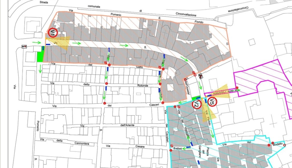 - l’area “ZTL 1” funzionerà (e quindi vieterà l’accesso ai non autorizzati) dalle 21 alle 06.30 in tutti i giorni dell’anno, con ingresso da via San Florido all’altezza dell’intersezione con via Pomerio San Florido (“Varco 1”);